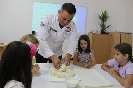 Поред приче о томе шта чини његово радно одело, како одржава правилно хигијену руку и свог радног простора учесници радионице опробали су се у изради плетеница од теста.